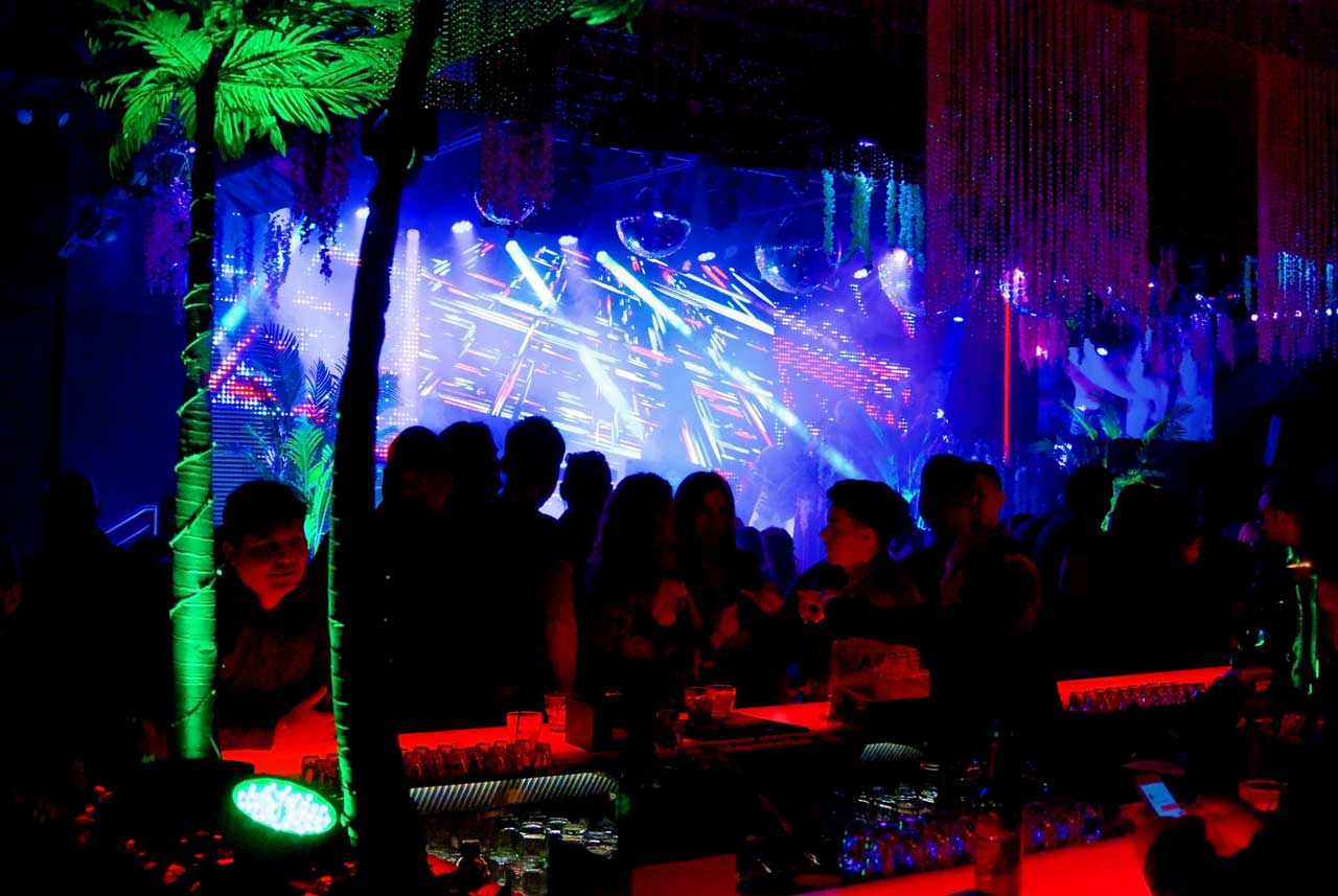 Huge 4-level nightclub pulses with electronic dance music in former LA Stock Exchange building.